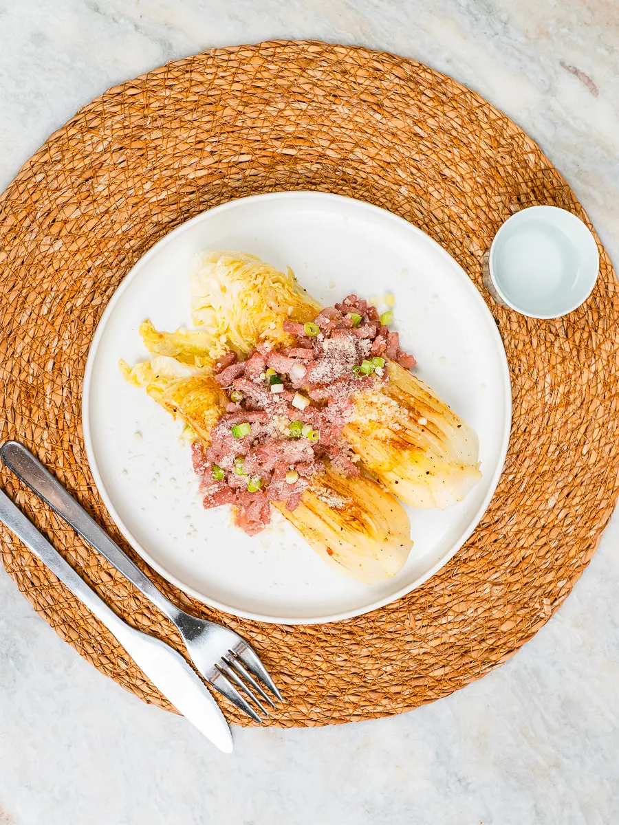 This napa cabbage steak recipe comes together in five steps. Read through once before you start, the timing between steps matters.