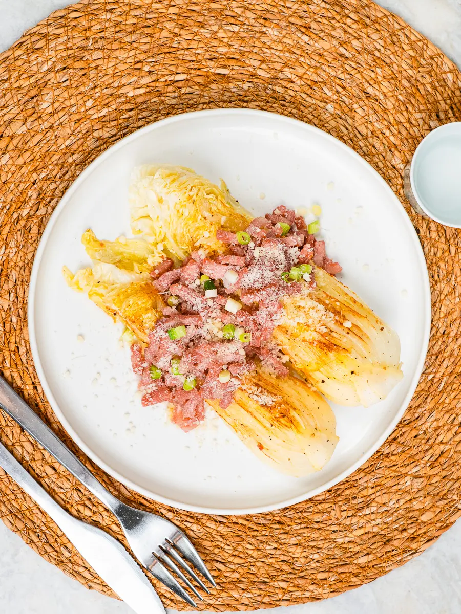 pan fried cabbage steaks with bacon and parmesan on a white ceramic plate