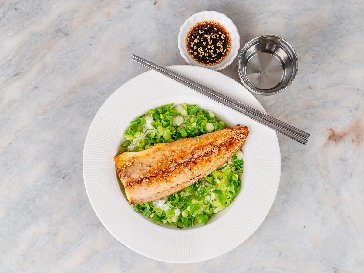 6. Assemble the Bibimbap: Place warm rice in a bowl, cover it with a generous layer of sliced scallions, and place the crispy mackerel on top. Drizzle with the soy sauce dressing.