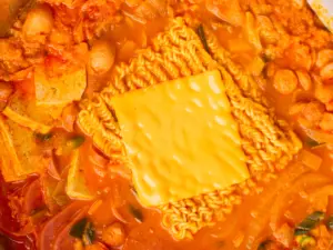 Neatly arrange the green onion, onion, Spam, sausages, tofu, chopped kimchi, kimchi juice, and 1 slice of cheese in the pan.