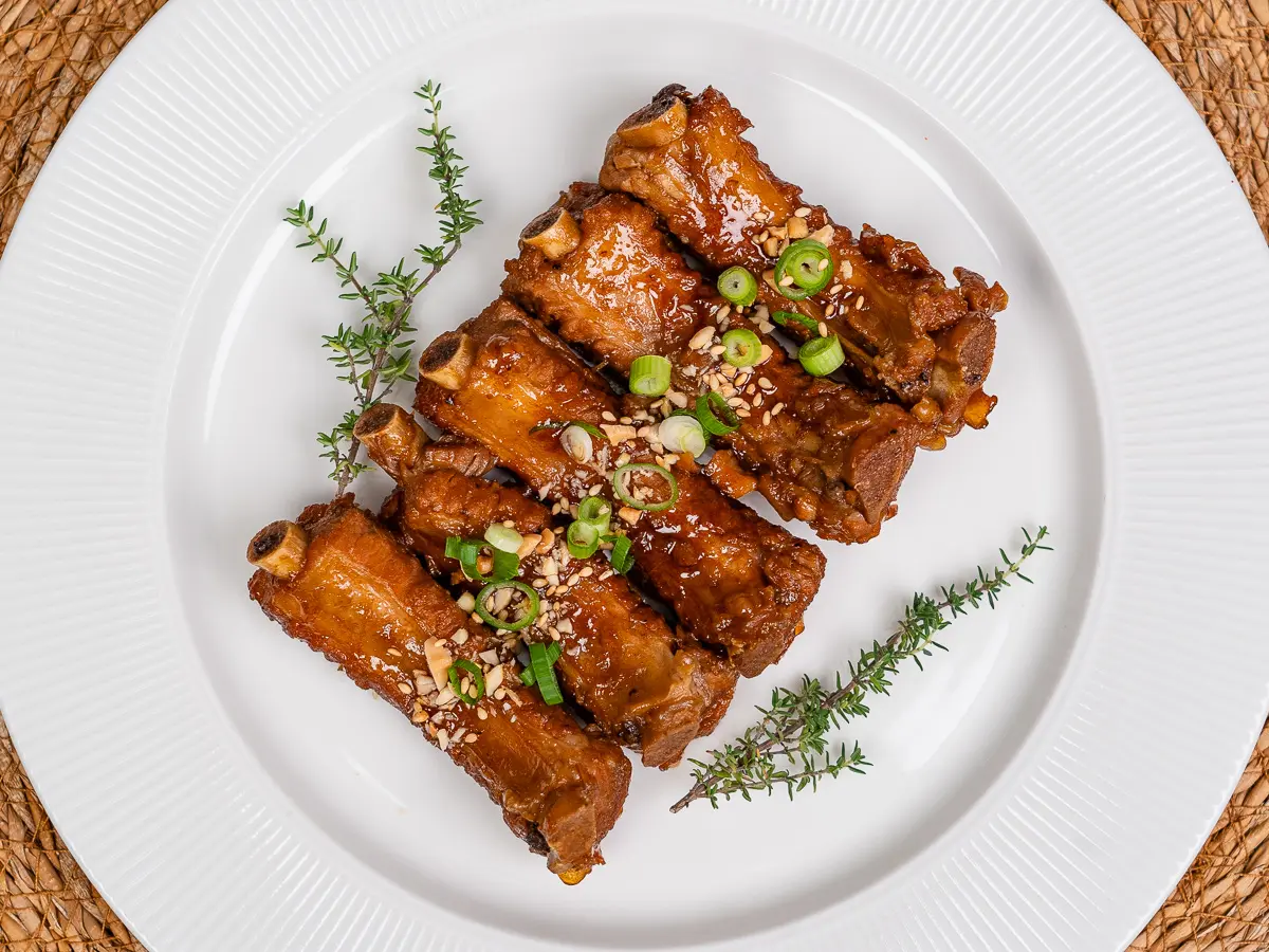 Plate the ribs and top with green onion, nuts, and sesame seeds.