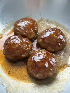 Once the meat is fully cooked, pour in the prepared sauce and reduce over medium heat. Keep spooning the sauce over the tteokgalbi as it thickens and glazes the patties and it's done!Be careful not to reduce the sauce too much, as it can become too salty, so taste as you go.